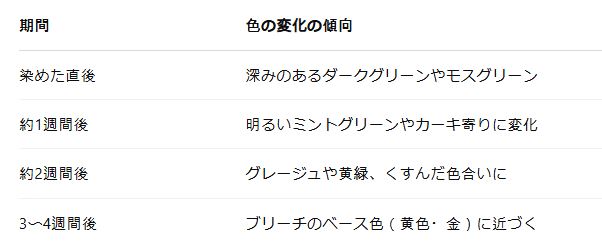 インナーカラー緑の色落ちは、染めた直後から少しずつ進行します。色味の変化には以下のようなパターンがあります: